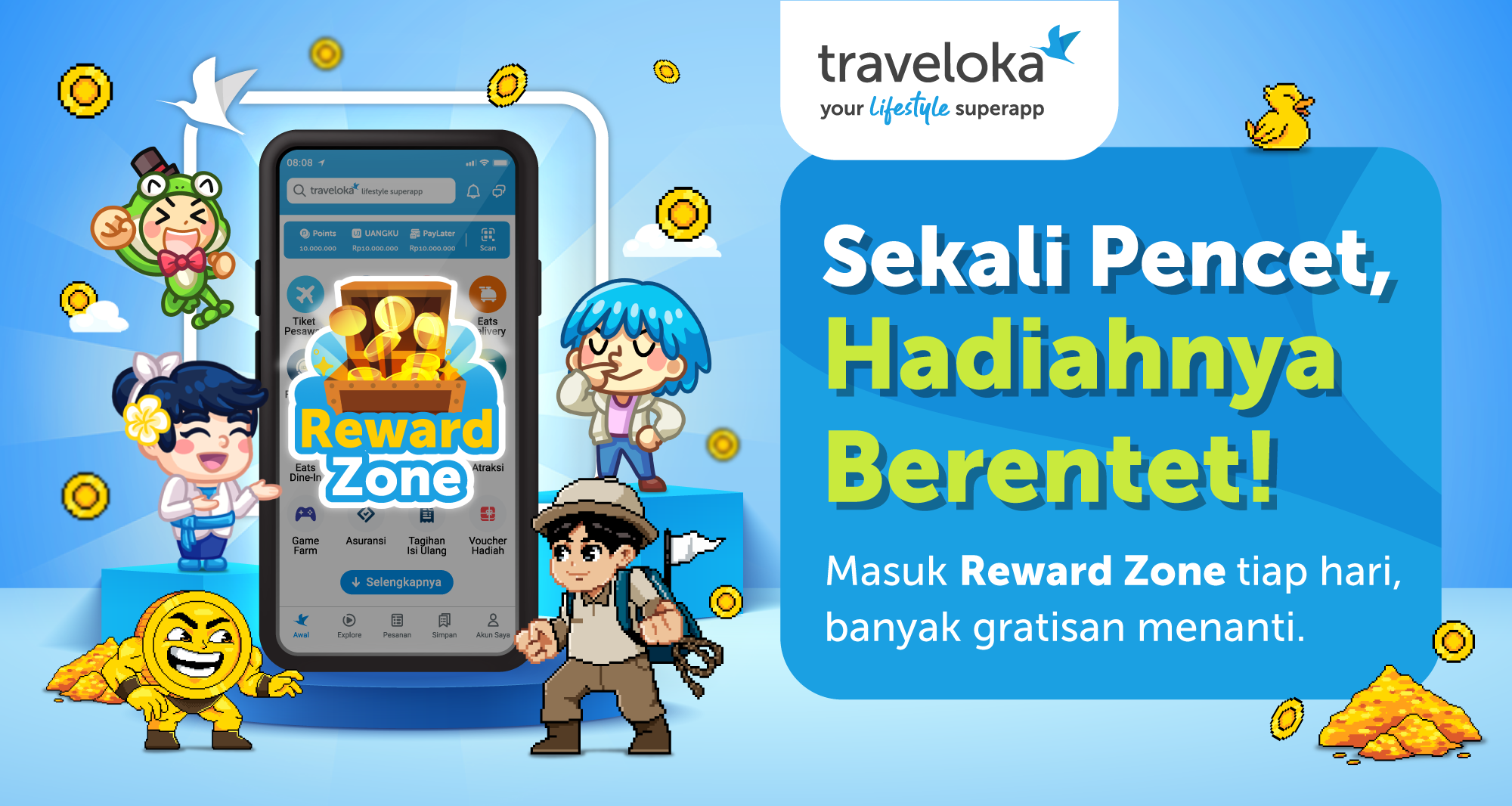 Reward Zone is a feature within the Traveloka App that offers a variety of fun mini games to beat boredom. The best part? You can earn tons of rewards and Traveloka Points just by playing games and checking in daily.